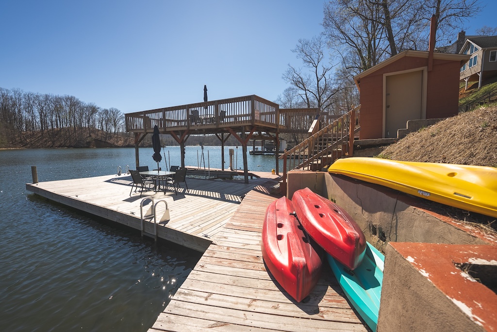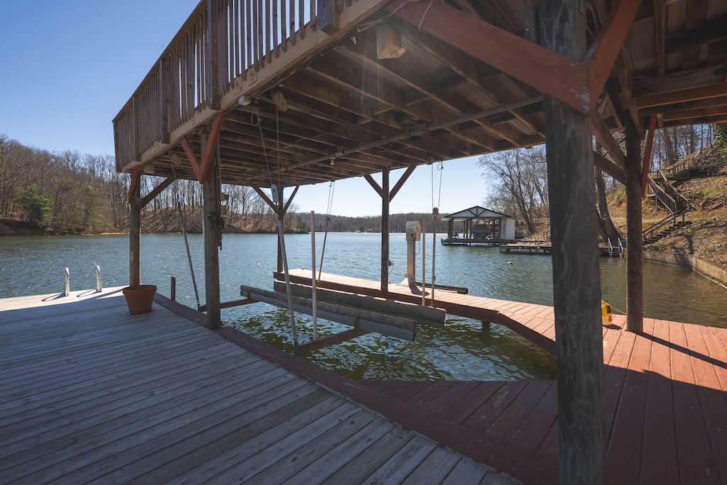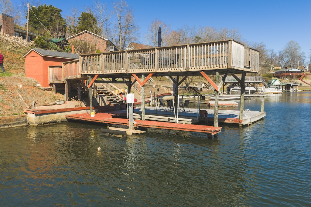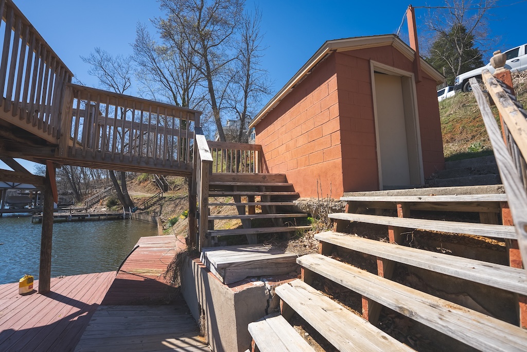 Outside, enjoy a spacious patio with a hot tub added in 2022, along with updated patio furniture that conveys. There’s also a 12’ x 12’ storage building great for storing things like a grill, outside furniture and more! The waterfront setup is a standout, featuring a floating dock and a double-deck dock with a boat lift and upper-level patio area. Dock boards have been replaced within the last two years, and brand-new patio furniture has been placed as well. A concrete storage building by the water provides convenient space for lake gear like life jackets, tubes, and fishing equipment. Property comes with all life jackets, fishing equipment, and many inflatables great for the water.